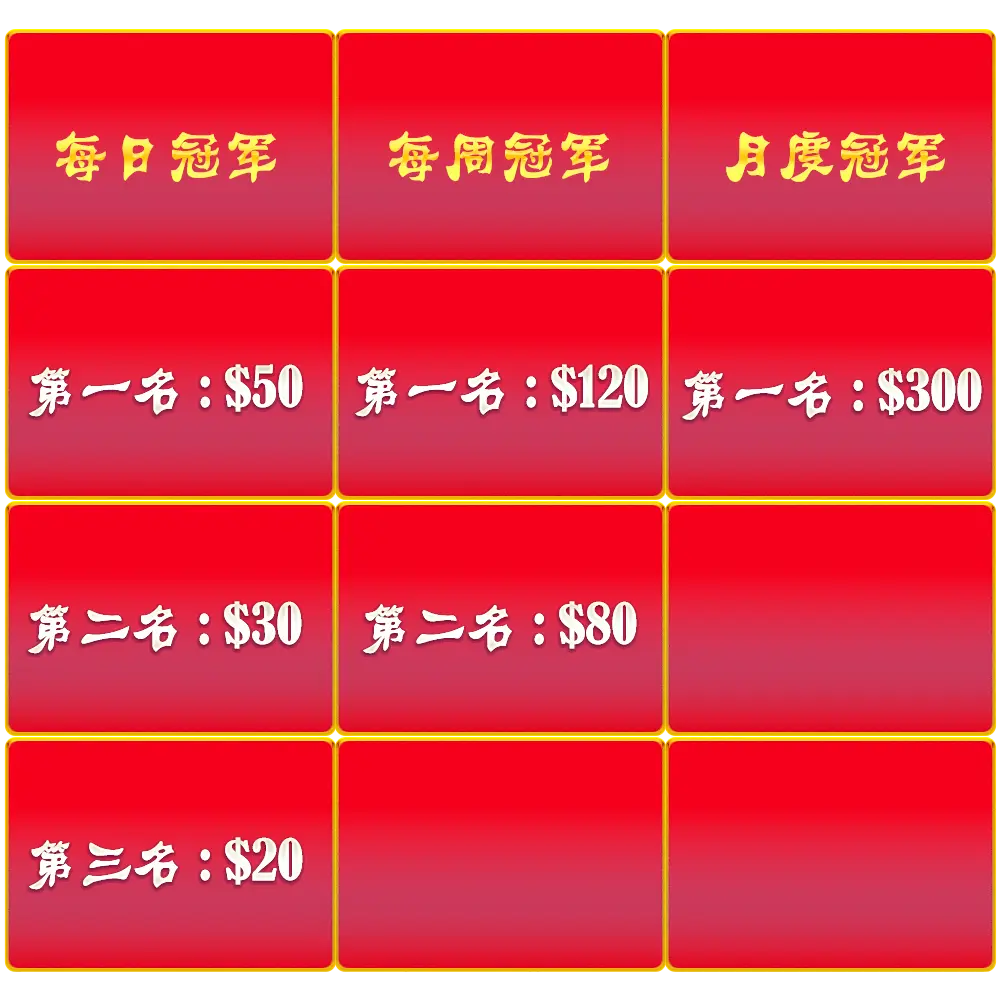 每日冠军:授予每日排行榜上获胜积分最高的前三名玩家。